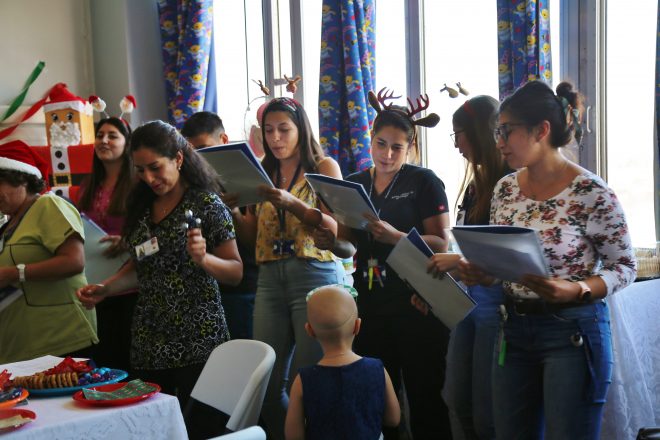 La fiesta navideña de la Unidad de Oncología Infantil del HCVB contó con la participación de un grupo de kinesiólogos de Rehabilitación quienes interpretaron populares villancicos, el viejito pascuero, pinta caritas y la Fundación Paz y Amor, entre otros aportes.